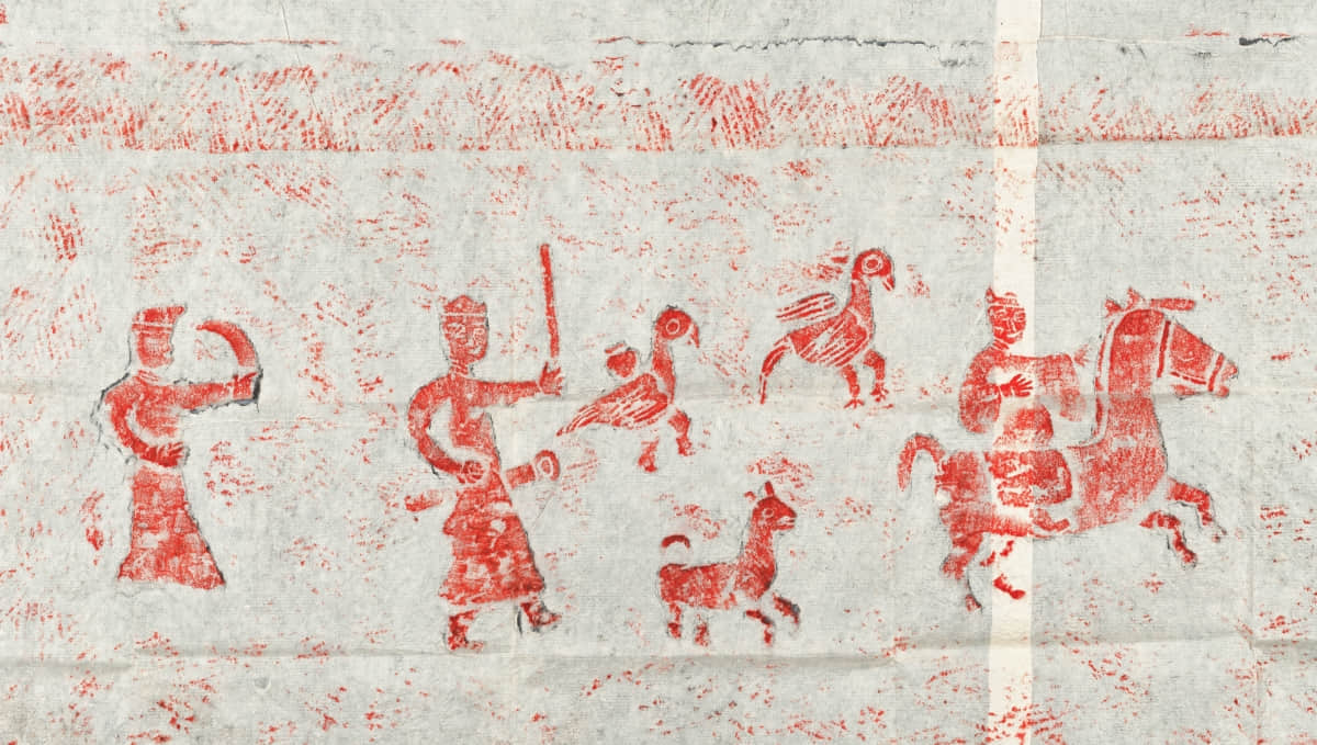 现代拓。朱拓,1/3 前为一骑,中为二鸟一犬,后有一人佩剑执刀,末一人手执物相随。图像阳刻减地,全聚于画面中心。 2/3 单阙下有一人执便面。3/3 鸟抓鱼。据高文《中国画像石棺全集》(山西出版传媒集团 2011 年版第 330 页),原棺为东汉时制,2002 年泸县云龙镇大田村出土,泸县博物馆藏。