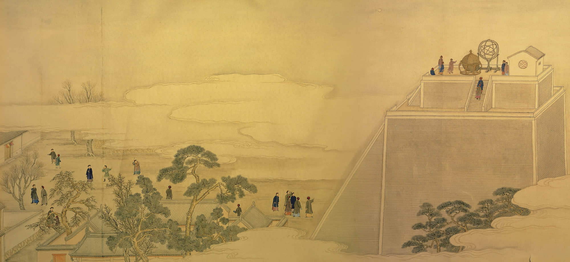 清乾隆二十五年(1760)年底,观象台钦天监预测隔年正月初一午初一刻(1761年2月5日上午11时15分)将出现「日月合璧五星联珠」的天文异象,预示是年「海宇晏安,年谷顺成」。「日月合璧」指日月同时升起,「五星联珠」指水、金、火、木、土五星排列成近乎直线。徐扬奉命绘图纪录此罕见的天文异象。新年元旦文武官员进京朝贺,市井百姓也纷纷出门拜年。画卷前中段绘有观象台,上并有浑天仪、天体仪两座观测星象的仪器,观象台两侧天空各画日、月。画中详绘胡同合院、牌楼城门;另有冠饰品服、交通工具、商店铺面等丰富形象,完整呈现北京城市面貌及风俗习尚。考文献纪录,当年正月五星位置确实相近,但未冠以「五星联珠」之称。或许正如款识所言,虽天象有兆,却未「宣付史馆」,而由徐扬此图扮演着与「文献」同功的纪实效能。